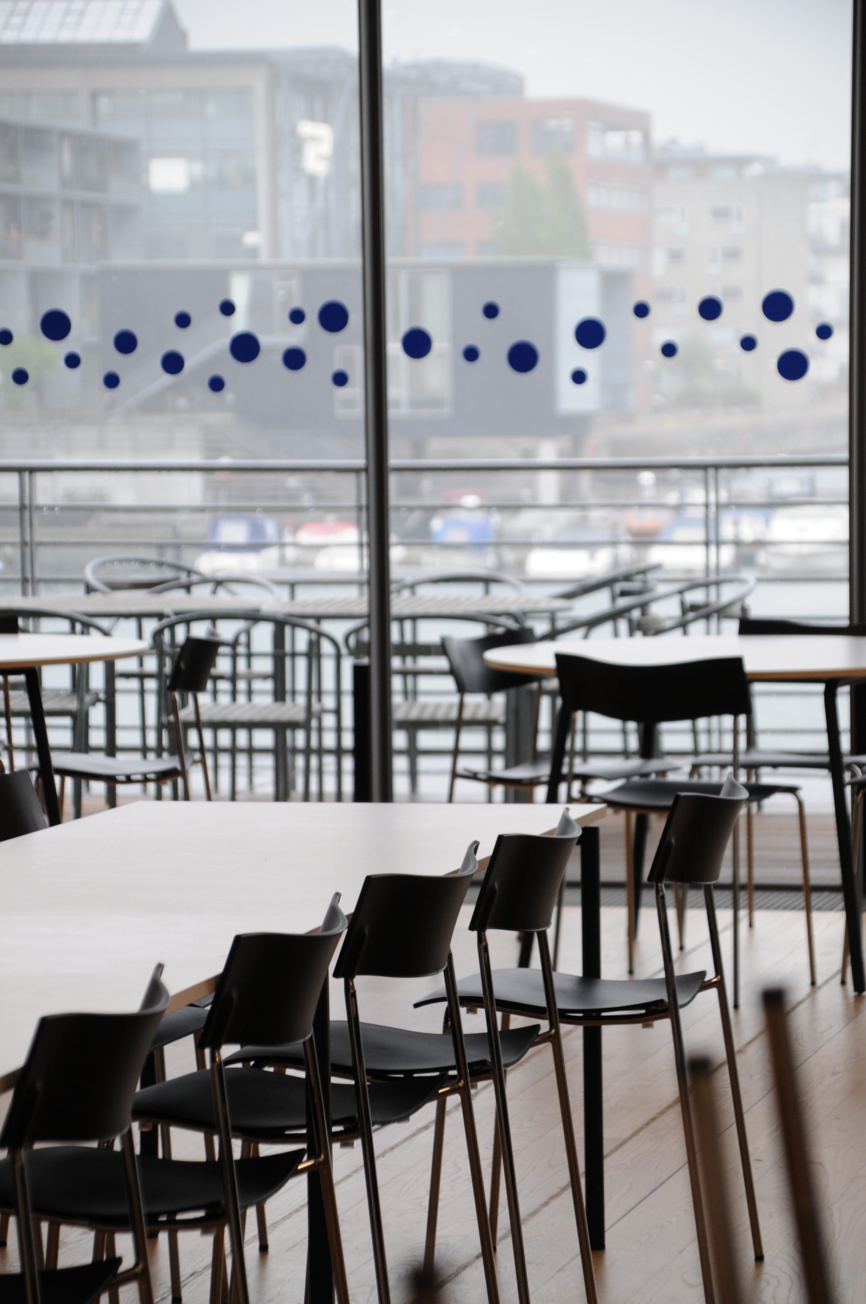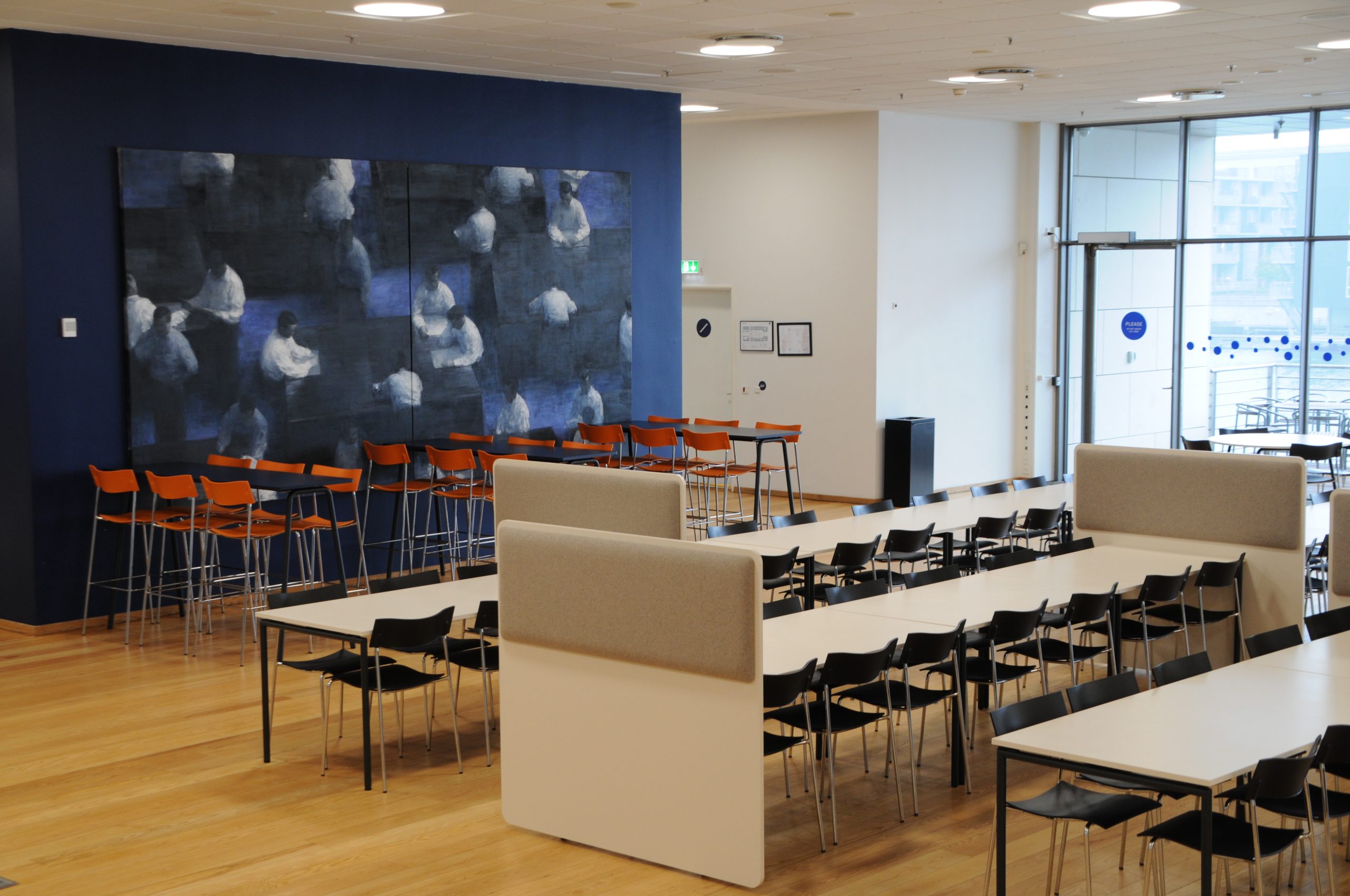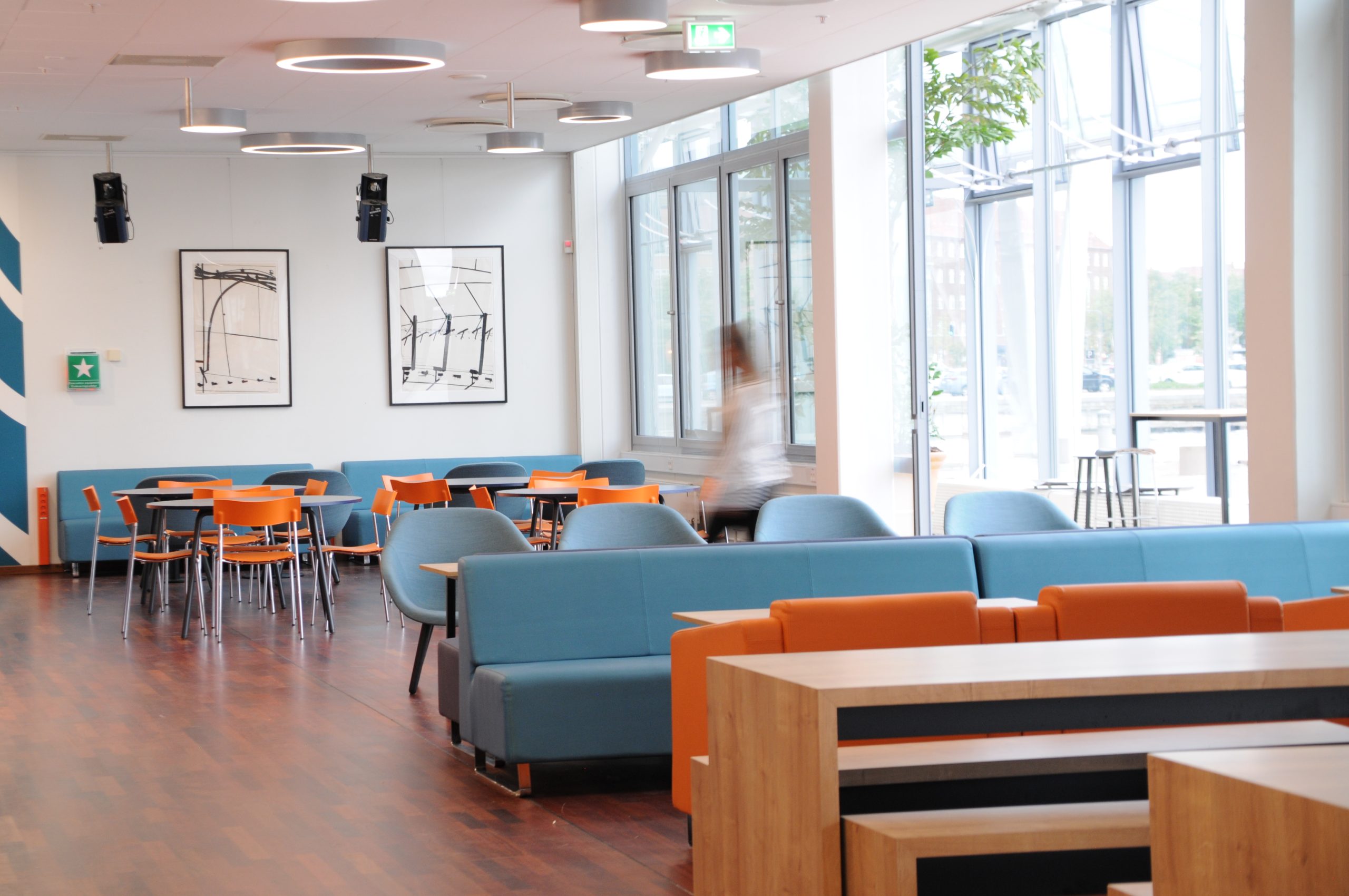 Her har vi indrettet både den store og den lille kantine, begge holdt i universitetets signal farver blå og orange.