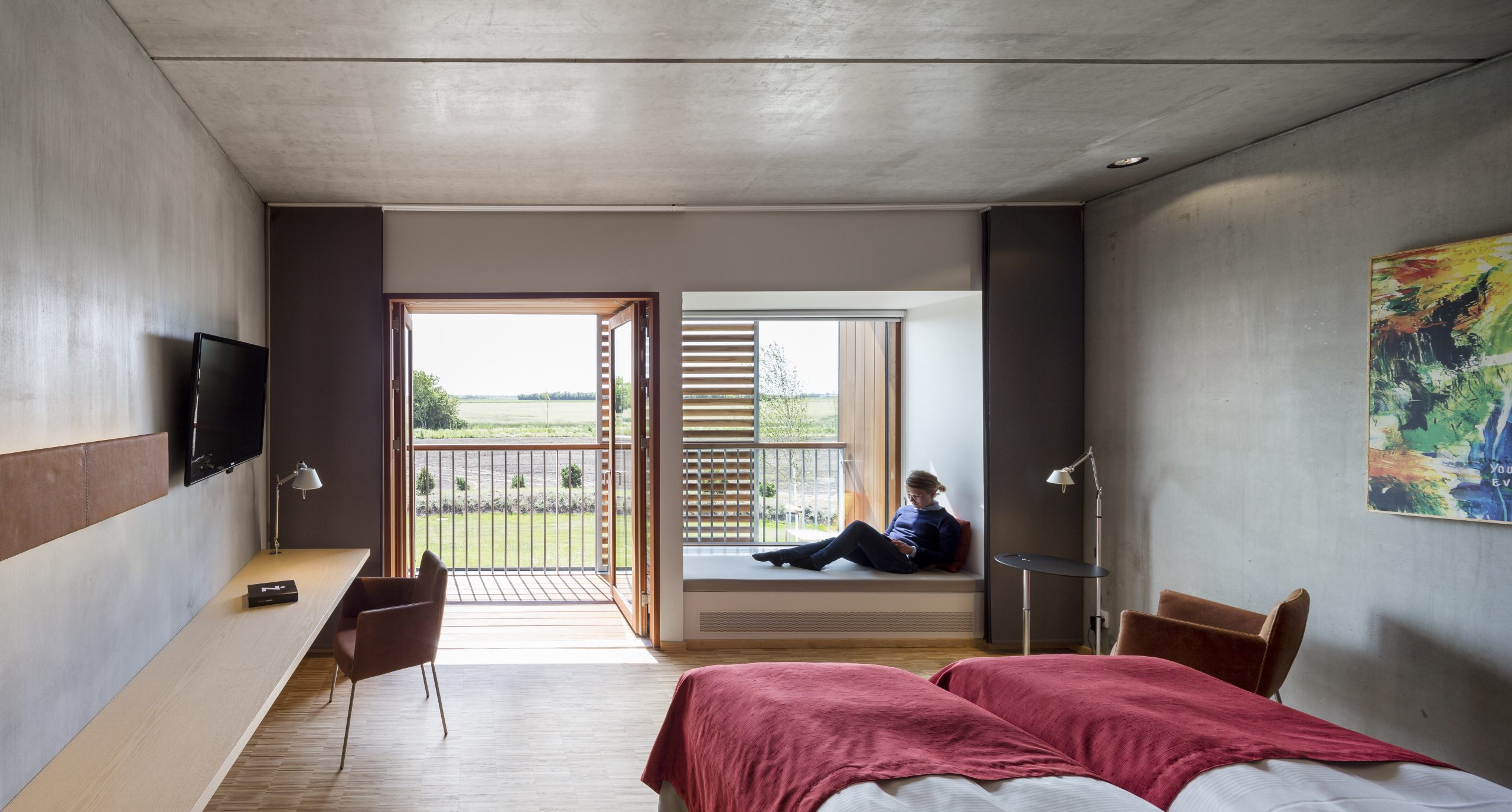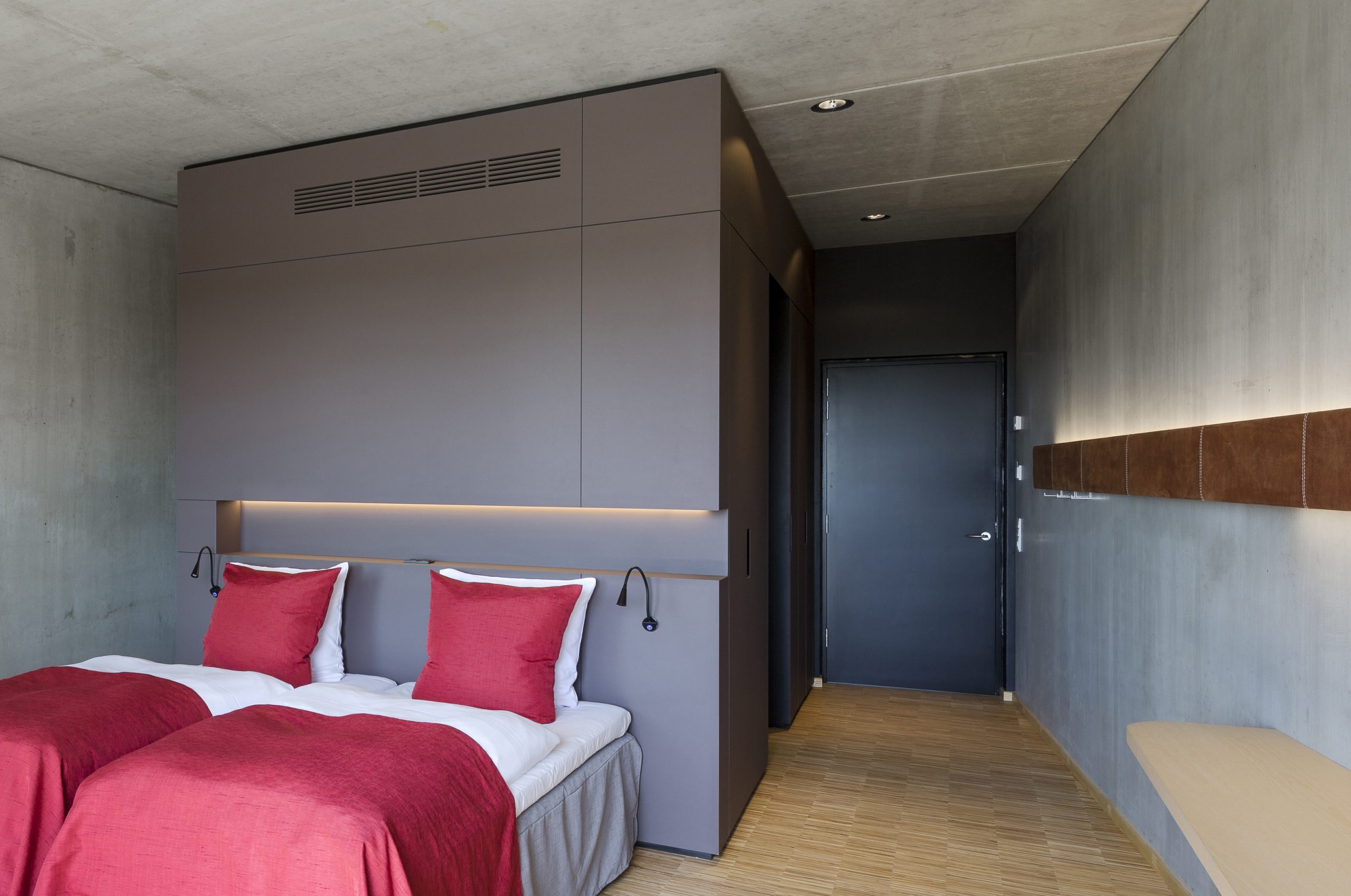 I 2012 vandt vi opgaven at udarbejde et Totalindretningskoncept til en ny rund tilbygning til Ecco Conference Centre Tønder. Arkitekterne Dissing+Weitling’s ønske var at Indretningen i det runde hus, i sit udtryk, skulle afspejle Eccos tilstedeværelse i hele verden gennem 4 kontinenter, i designudtryk, farver og materialer. Udover forslag til alt løst inventar og belysning til loungeområder og værelser, udarbejdede vi også design til specialinventar, bl.a. garderober/sengegavle i værelserne, bygget op omkring de præfabrikerede toiletkerner.