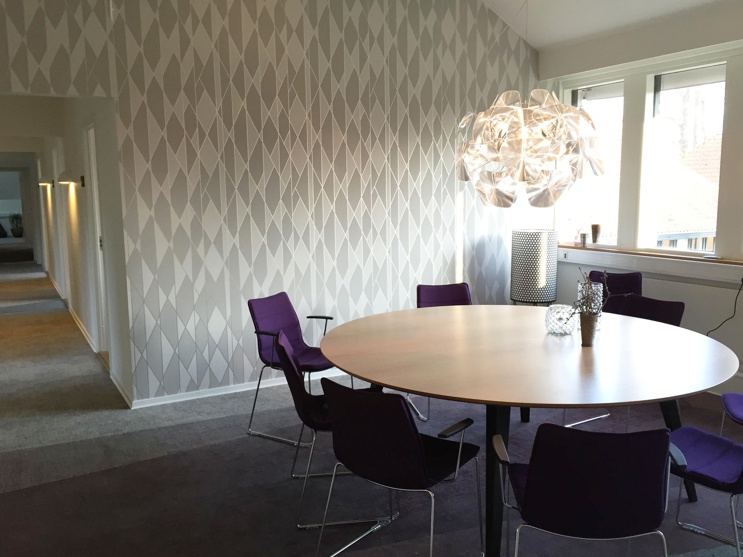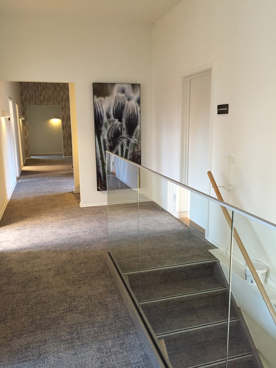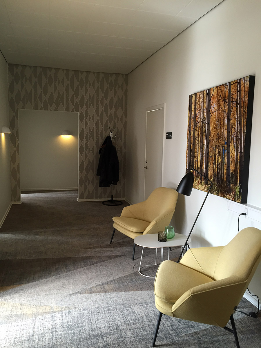 I samarbejde med Ege tæpper, designede vi en tæppeløsning med farvede felter for at bryde det lange gangforløb. I samspil med vores valg af tapet, belysning og loungemøbler, fik gangene et mere indbydende og spændende udtryk.