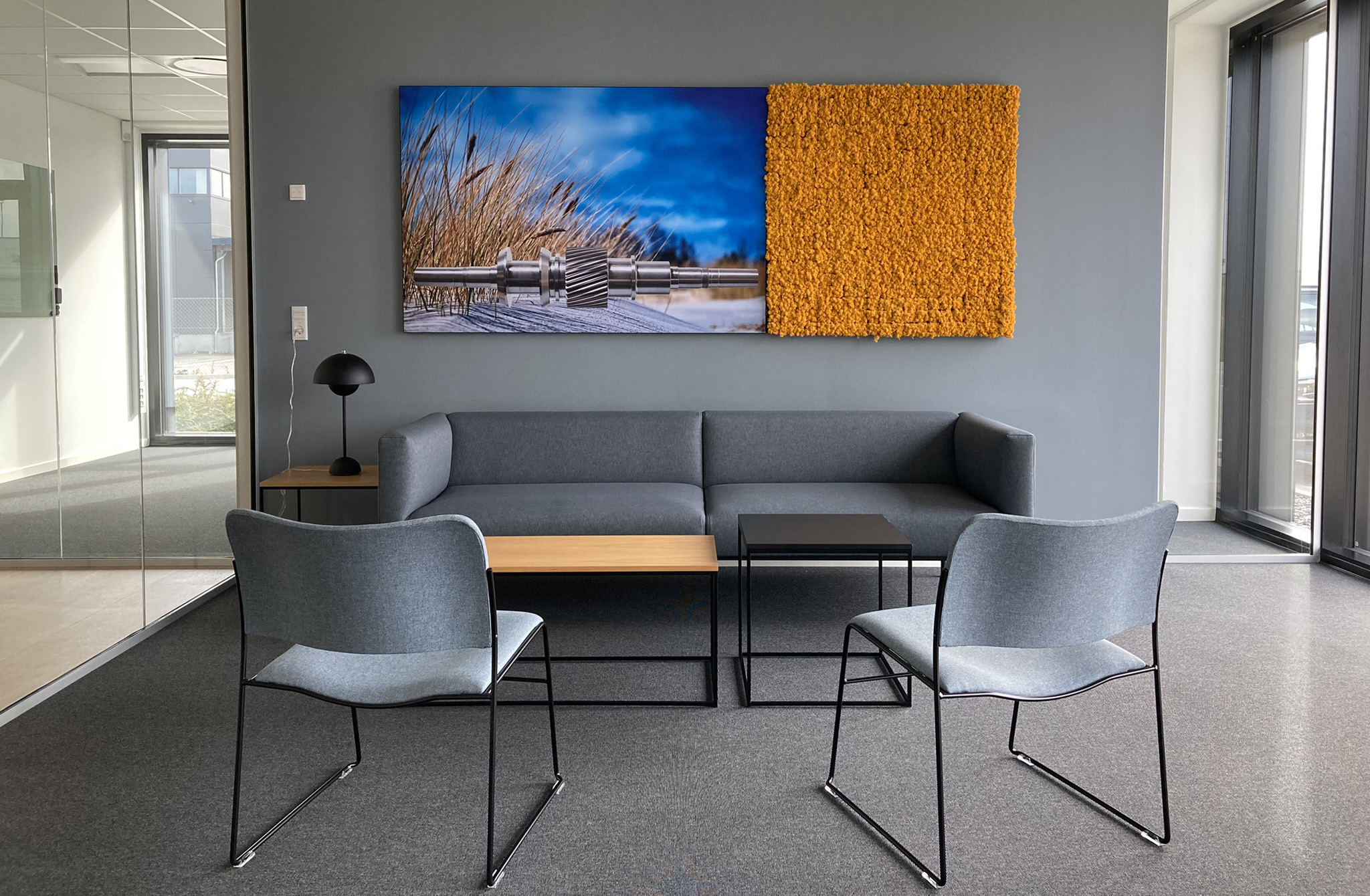 De ønskede et gennemgående design gennem alle rum i forhold til farver og overflader og vi har samarbejdet omkring vægdekorationer med en kombination af deres egne fotocollager kombineret med mos i forskellige farver.