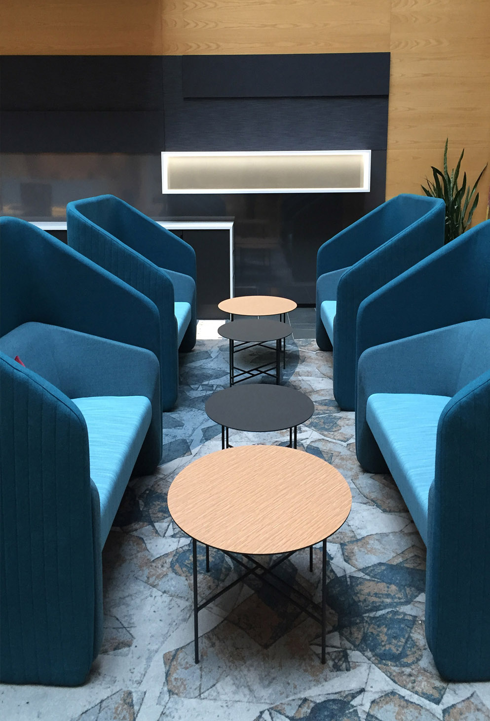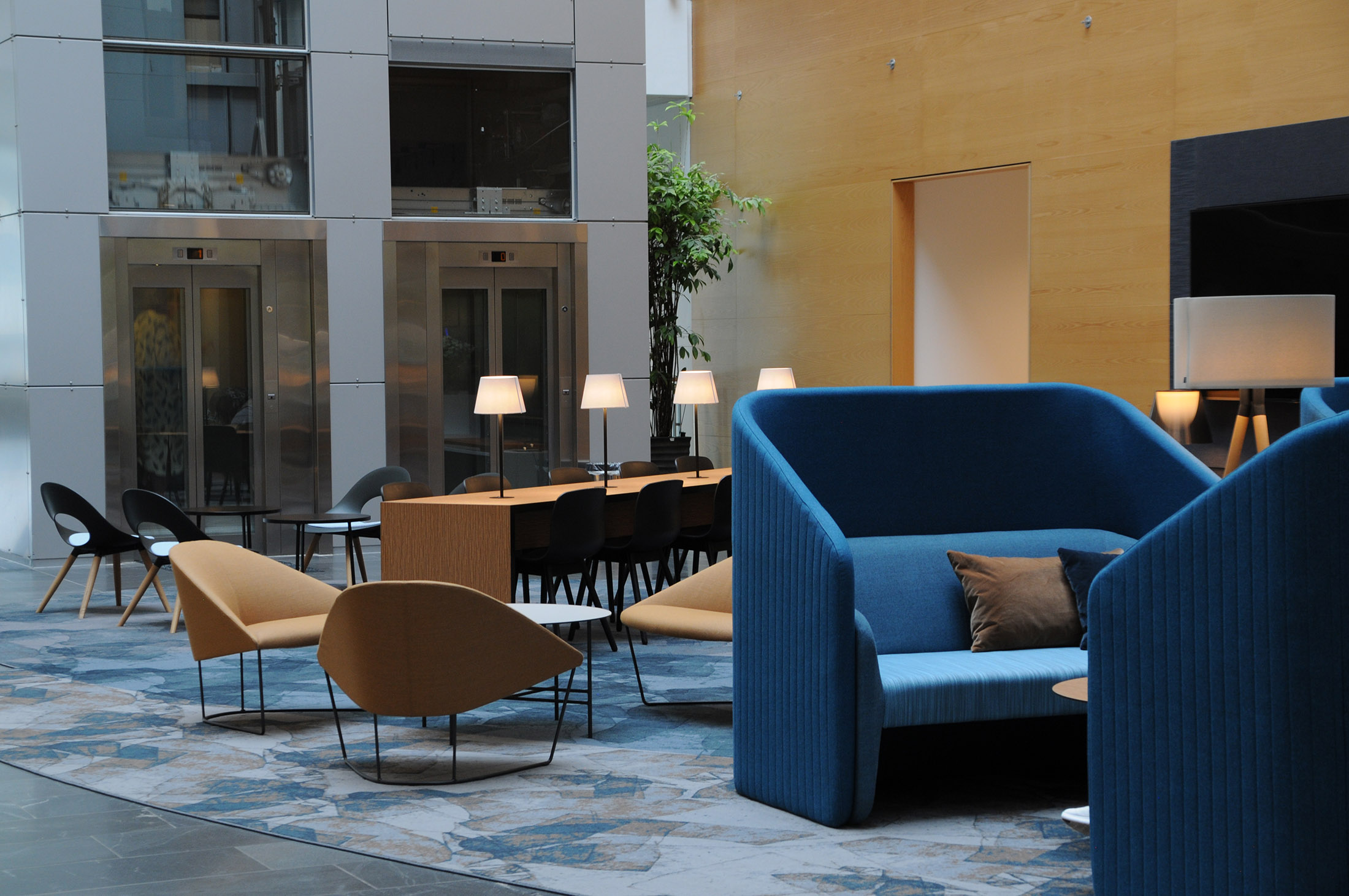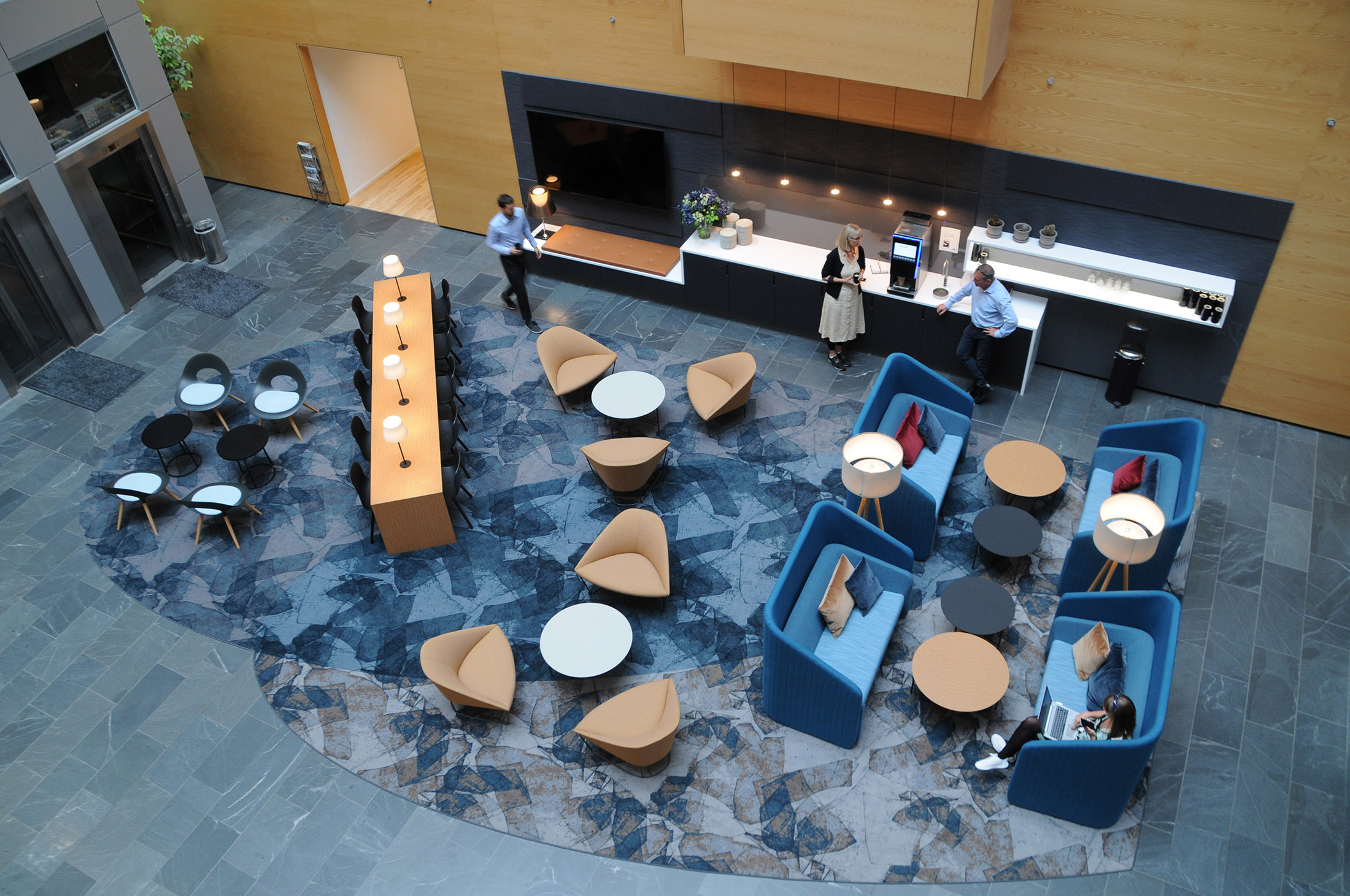 Vi fjernede receptionsrummet til fordel for et stort anvendeligt loungeområde med forskellige siddemuligheder, arbejdsområde og info-skærm, placeret på et stort specialdesignet tæppe.