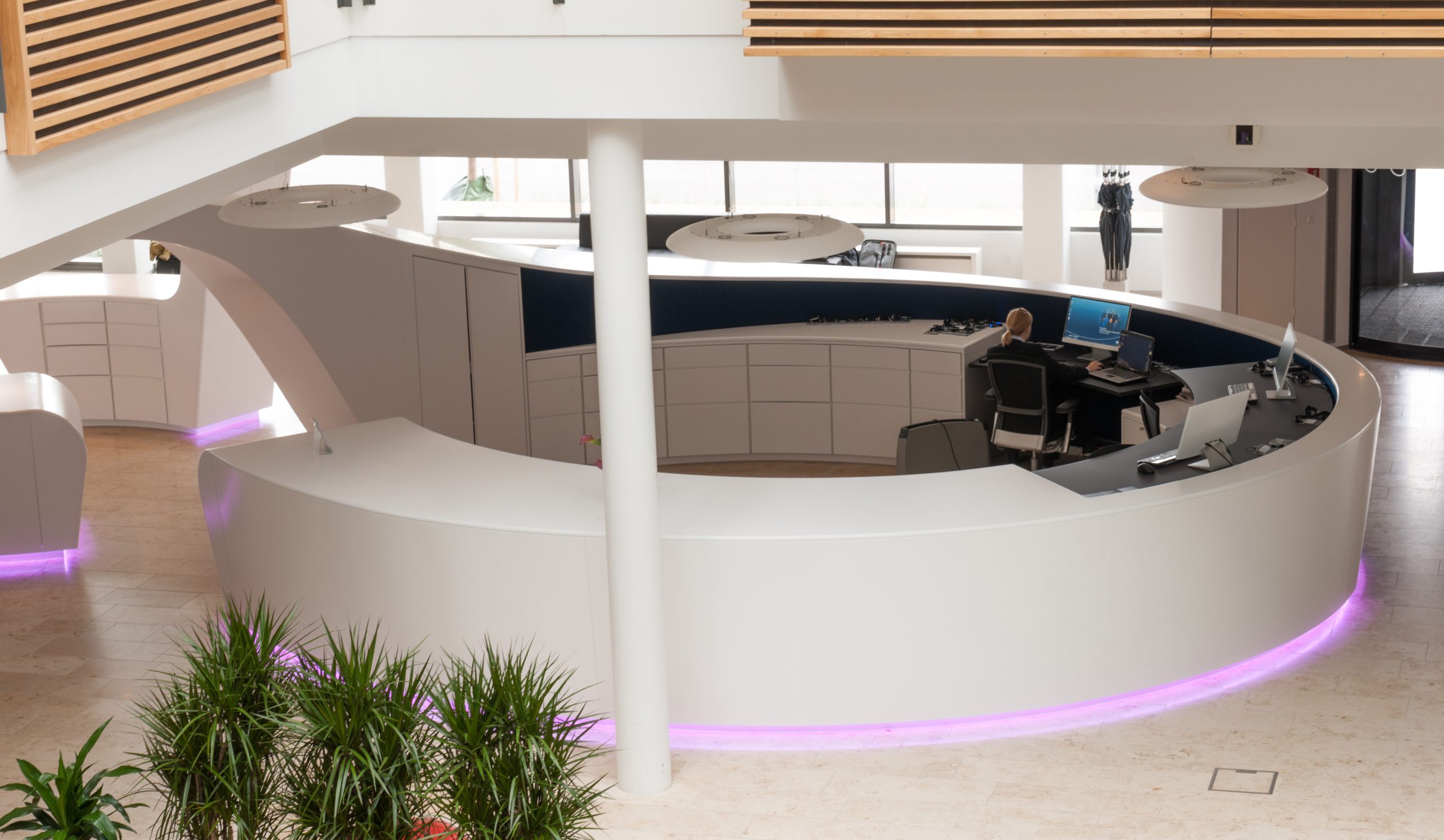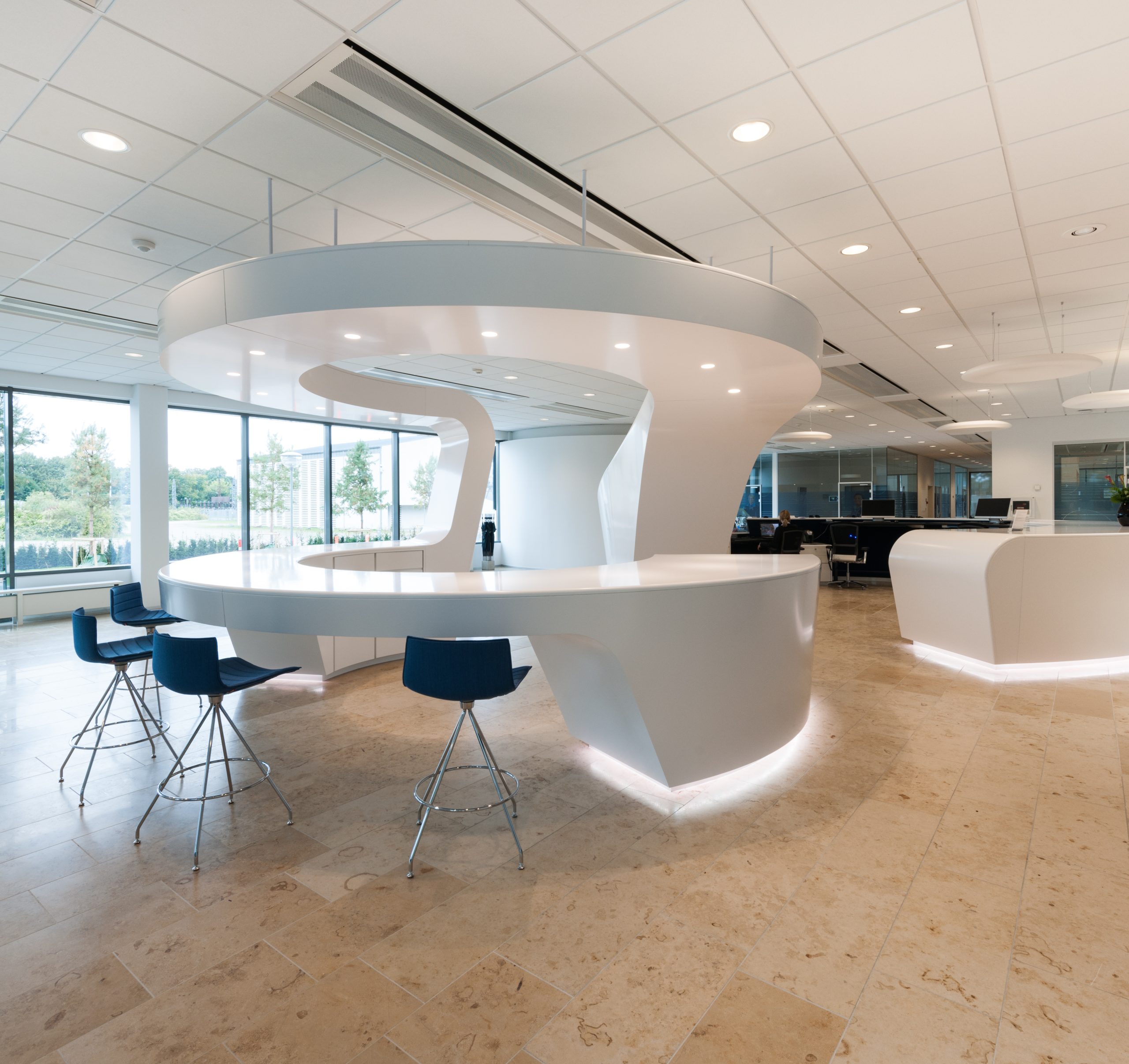Kunden ønskede et ’state og the art’ møbel der kunne samle skrankefunktion og caféområde i et i deres lobbyområde. Begge funktioner skulle kunne betjenes af receptionisterne uden at forlade møblet. Resultatet blev en smuk organisk skulptur der integrerede alle de ønskede funktioner og opfyldte alle kundens krav til brug og opbevaring. Det var en fantastisk spændende proces at udvikle form og funktion af møblet og realisering af det i samarbejde med D+W og dygtige Steen Larsen fra Solrød Møbelsnedkeri.